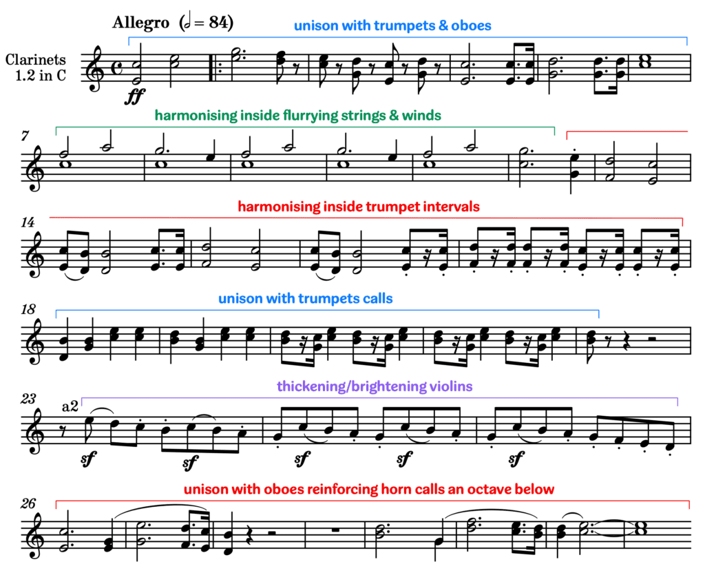 As the craft of orchestration started to evolve forwards from basic colouration and interactions of players developing themes, toward a more refined and grandiose command of colour and texture, the perception of a C clarinet’s properties became more specific and less integrated alongside the B♭ and A. For instance, in Berlioz’s Symphonie Fantastique, C clarinets are scored in the B♭ fourth movement’s “Marche supplice” exactly because of their more penetrating brightness alongside cornets and trumpets. That could be the only justification for withholding B♭ clarinets in this context considering the key.