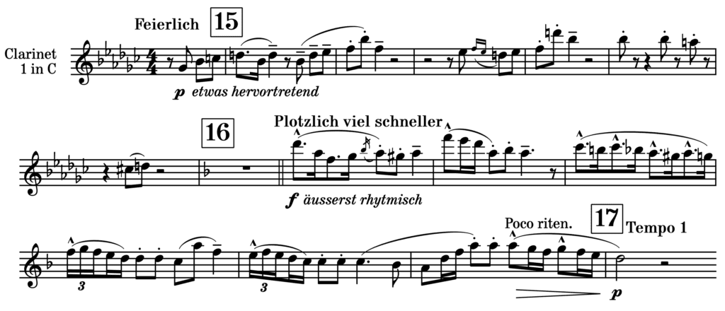 And yet, before you rush over to your workstation and start composing your next masterpiece including C clarinet, you have to ask yourself why you think it’s necessary. Because every reason has a valid counterargument. The first is brightness of colour. While the C clarinet is naturally brighter than the B♭, that doesn’t mean that the latter can’t also play brightly and perkily, even to the point of aggravation, in its clarino register. And of course, if all you really want are piercing high notes, then the E♭ is already built for that, and far easier for the vast majority of section players to get their hands on if they don’t already own one. This especially goes for the chalumeau register; if you really want that shallow, hollow lower sound, then the E♭’s quality in that regard is much more pronounced.