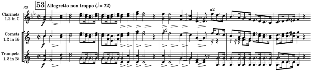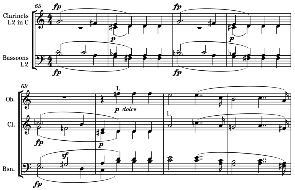 Further on, Beethoven allows the clarinets to speak out more on their own, albeit cushioned by doubling from violas and cellos, yet highly spiced with their intensely reedy quality. Here’s where modern B♭ clarinets are at a disadvantage in expressing Beethoven’s intentions, as they cannot match the blatant brightness of the C clarinets over the same sounding pitches, evoking the common-man simplicity that he heard and admired in the folk band playing which he’s emulating here.