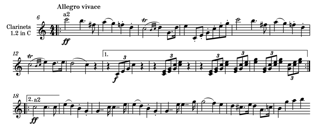 Mendelssohn’s high C’s here notwithstanding, the more typically employed range of the C clarinet in those times covered around an octave-and-a-half from D4 to G5: avoiding the lowest range of the chalumeau and the brightest notes of the clarino (and leaving out the altissimo register altogether). This logically kept the C clarinet’s less appealing characteristics of shallow low notes and lighter high notes to a minimum, while pushing its stronger, richer range to the forefront. The 1st clarinet part from Beethoven’s 1st Symphony bears this out, with notes sticking mostly to the staff between D4 and G5. The occasional A5, C4, A3, and G3 make appearances, as does a nice popping C6 at the end. Admittedly, the 2nd clarinet makes more use of its lower range, but usually in harmony with the 1st clarinet or within a greater texture.