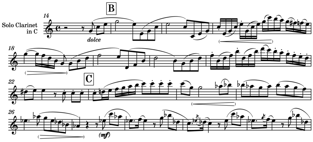 Furthermore, it’s probably not the greatest idea in the world to score for C clarinet if it’s your first-ever experience writing clarinet parts. Any kind of specialist instrument really deserves to be approached by a composer with a great deal of experience and insight about the standard model of its family – in this case, the B♭. And perhaps with enough time spent learning the awesome capabilities of that basic workhorse, which I feel far outstrips any other member of the clarinet family in its potential, you won’t feel the need to score for the C at all. I certainly haven’t yet, after 5 decades as an orchestral composer. But I won’t turn down the offer if it arises.