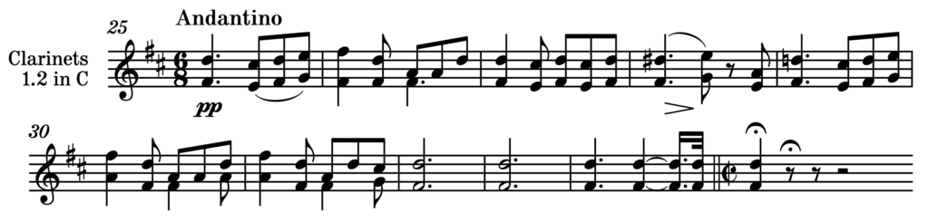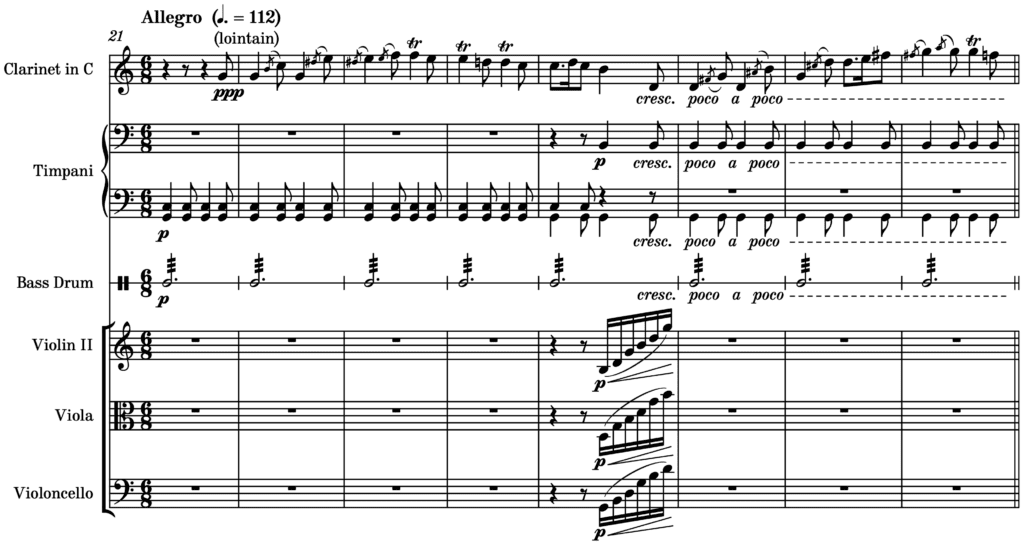 Later on in the 5th movement, Berlioz uses the C clarinet to embody the mocking laughter of his fantasy lover who has become a witch at the black sabbath held over his grave. Here, the more shallow, piping quality of tone is at a premium, with the clarinet’s very exposed voice cackling across that same choice range of D4-G5. Later on in the same movement, the E♭ clarinet will echo the same passage even higher and more shallowly – but here in the first statement, we at least hear a more balanced, stronger sound, for all its leanness. This extreme exposure of the C clarinet’s character was probably completely alien to the audience of the time, regardless of the appearance of the instrument in many other less blatantly picturesque works.