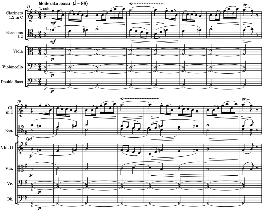The C clarinet, on the other hand, had a brighter tone approaching the E♭ – and yet with much more muscle. Gevaert described it as “dazzling to the point of harshness.” Composers of the day would of course assign it to pieces in the key of C for which it was built; and also G in some cases. But looking over the repertoire, we see a few caveats added onto the equation, the most important of which would be that the music’s character would tend toward a more powerful, assertive expression. For instance, in the fourth movement of Beethoven’s titanic 5th Symphony, a very noteworthy appearance, two C clarinets state the opening theme in unison with trumpets and oboes, easily contributing a clear, intense colour inside this powerful combination. From there, Beethoven scores his pair of C’s in a way that’s very aware of their power: harmonising inside the flurrying strings and winds, playing an octave above the trombones; then descending to play harmony and harmonic rhythm inside the trumpets like two additional trumpets; then unison with trumpet calls under more swirling upper strings and winds; thickening and brightening 1st and 2nd violins; and then unison with oboes reinforcing the horn cals an octave above. It’s all a tremendously exciting moment, made all the more powerful by the use of C clarinets.