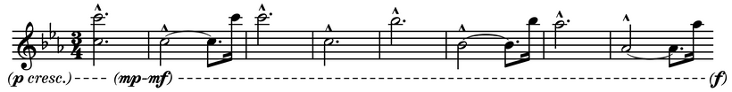 Notice, though, my qualification of the word “forte” – as in “forte marcato accent.” Of course, the focus of this chapter is almost entirely on the use of the marking forcefully, as that’s the general thrust of its application in concert and film scoring. But the composers and musicians who invented the marking had a more general conception than such a high-stress definition. Looking at early Romantic works, we see some composers applying marcato as a broader kind of accent, more fully-inhabited than quickly spent. In Schumann’s Rhenish Symphony, for instance, the marcato dotted half notes in a piano crescendo passage are usually played in a rather squishy way – with a gentler dig, a fuller shape, and a gentle defining cutoff setting up the next such note. This sets up a persistent yet not too aggressive emphasis on the downbeat of each bar.